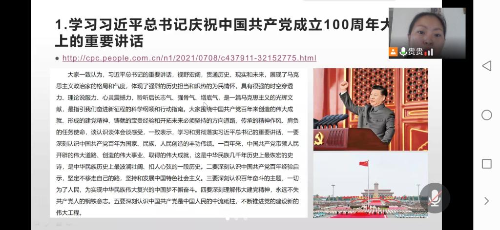 本次会议共5项议程,首先,组织学习了中央关于组织生活会与民主生活会的有关规定和要求、习总书记在党史学习教育动员大会以及习总书记在庆祝党成立 100 周年大会上的重要讲话精神。大家一致认为,习总书记的重要讲话,视野宏阔,贯通历史、现实和未来,更加增强了国家自豪感及民族幸福感。