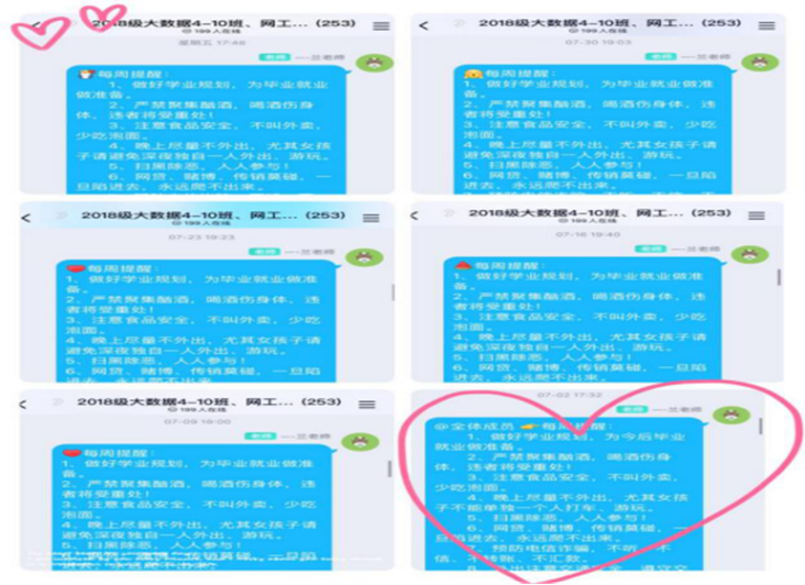为了让暑期安全与疫情防控工作落实到位,大数据与软件学院全体辅导员通过QQ年级群、QQ空间、线上年级会、每周五安全提醒、日报告等多种方式,持续关注学生动态。同时,通过短信或电话的方式与家长取得联系,获悉学生情况并告知相关安全注意事项,以家校携手的方式,确保安全工作落实到位。学院内部通过点对点、点对面的方式,组织班委骨干、学生党员等队伍,积极做好中高风险区学生排查与全院师生健康管理。大数据学院全体辅导员老师们始终绷紧安全工作这根弦,把安全工作放在首位,警钟长鸣,紧抓不懈,努力确保学生安全返校。