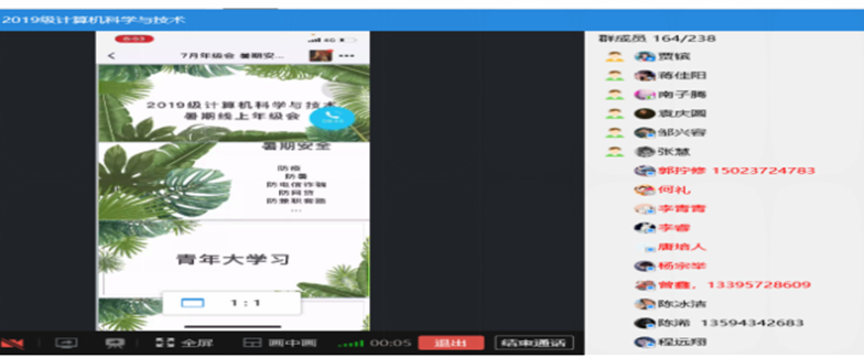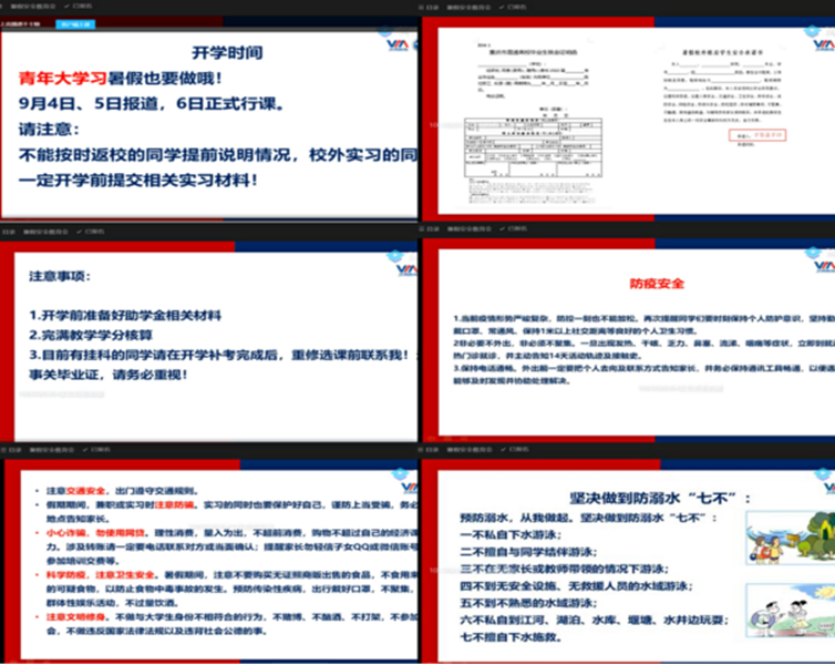 2020级辅导员老师在8月6日至7日分别在腾讯会议开展了暑期安全教育线上主题年级会,就“疫情防控”、“网络安全”、“防溺水”、“防诈骗”等相关内容做出提醒和宣传教育,让同学们树立“珍爱生命、安全第一”的意识。