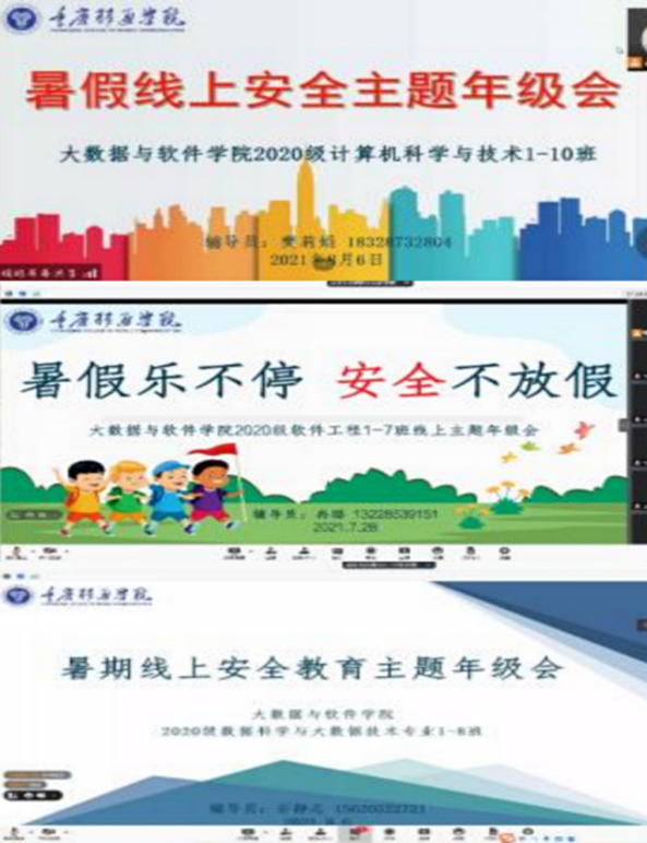 安全不放假,平安过暑假。暑假期间,大数据与软件学院全体辅导员通过线上年级会等多种形式开展安全教育工作,为同学们的暑期安全防范敲响警钟。
