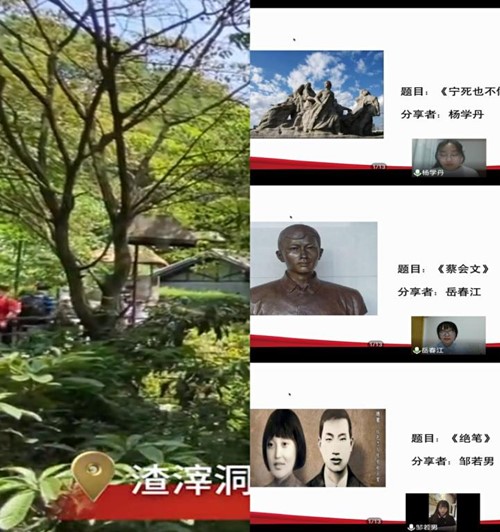 然后,支部全体党员秉承谦恭之心,跟随镜头一起“云旅游重庆红色景区”,在渣滓洞、白公馆等红色教育基地中,深刻感受到革命党人矢志不渝的坚定信念。与此同时,杨学丹、岳春江、邹若男三位同志分别以饱含深情的话语向大家讲述了《宁死不做俘虏》、《蔡文会》、《绝笔》三个红色故事,带领大家在历史的大江大河中,感悟革命英雄事迹,体会浩然正气。
