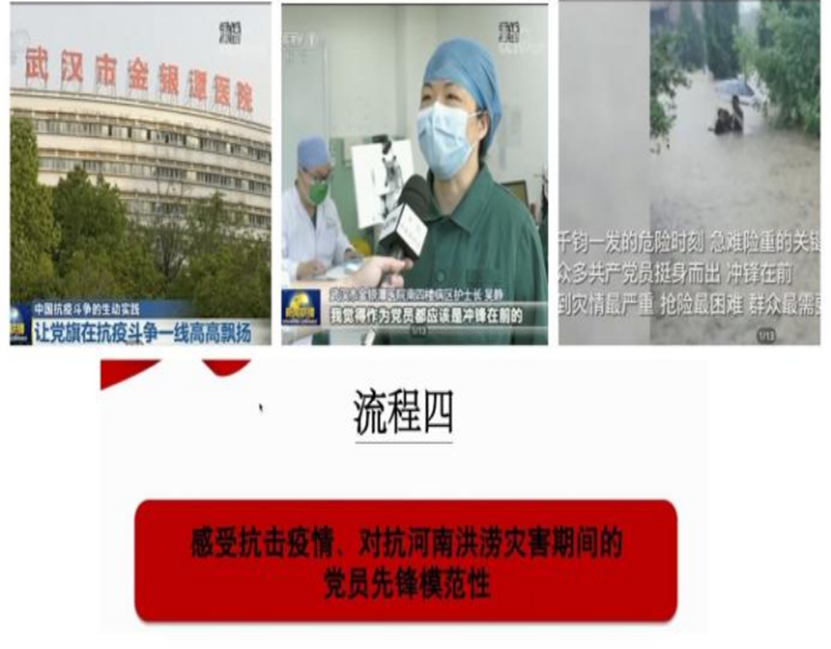 随后,通过央视新闻报道,大家观看了在抗击疫情和对抗河南洪涝灾害期间的党员先锋故事。在疫情和灾难面前无数党员同志前赴后继,在群众最需要的地方冲锋在前,努力保障人民群众生命安财产安全,他们用实际行动落实了对党和人民的承诺,践行了初心和使命。