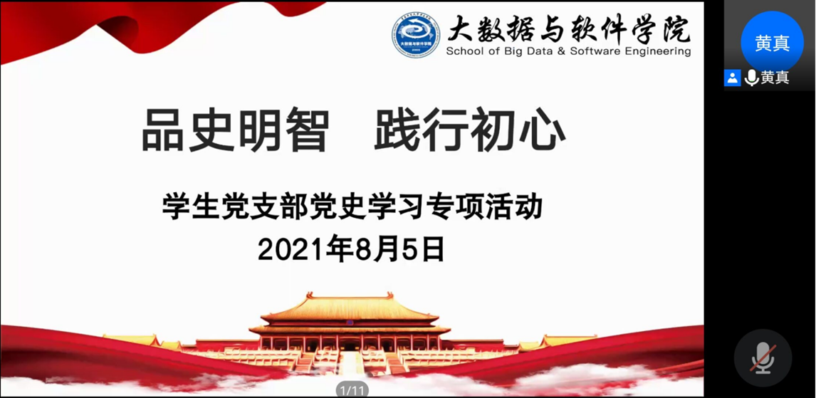 为深入贯彻落实习近平总书记关于党史学习教育重要讲话精神,持续推进党史学习教育,确保学习取得实效,进一步激发支部党员践行初心,凝聚思想共识,增强“四个自信”、坚定“四个自信”、做到“两个维护”。大数据与软件学院学生党支部于8月5日晚上8点,通过腾讯线上会议召开以“品史明智 践行初心”为主题的党史学习专项活动。