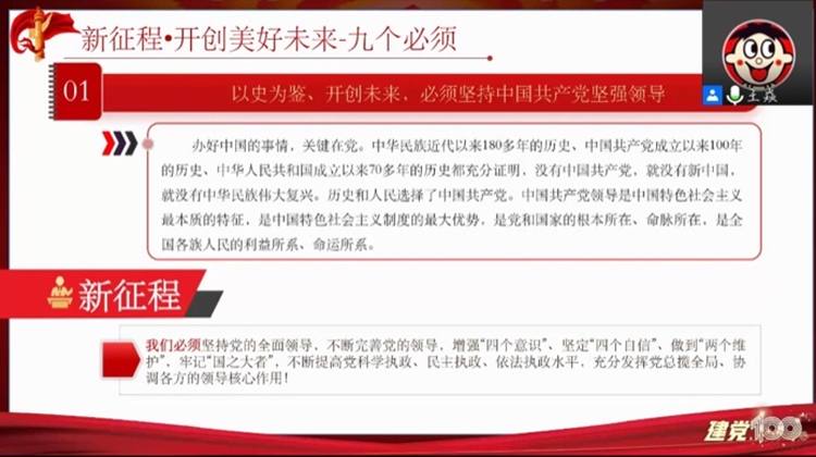 会议伊始,支部王焱书记以PPT的形式,从“回顾百年光辉历程-四个伟大成就”、“诠释中国共产党的伟大建党精神”、“新征程•开创美好未来-九个必须”等五个方面带领全体党员同志深入学习了“中国共产党成立100周年大会上的重要讲话精神”。他强调“中国共产党成立100周年大会上重要讲话精神”,是新时代中国共产党人不忘初心、牢记使命的政治宣言,是我们党团结带领人民以史为鉴、开创未来的行动指南。任何时候我们都要坚持以习近平新时代中国特色社会主义思想为指导,深刻领会和把握讲话的重大意义、丰富内涵、核心要义、实践要求,切实把思想和行动统一到讲话精神上来。