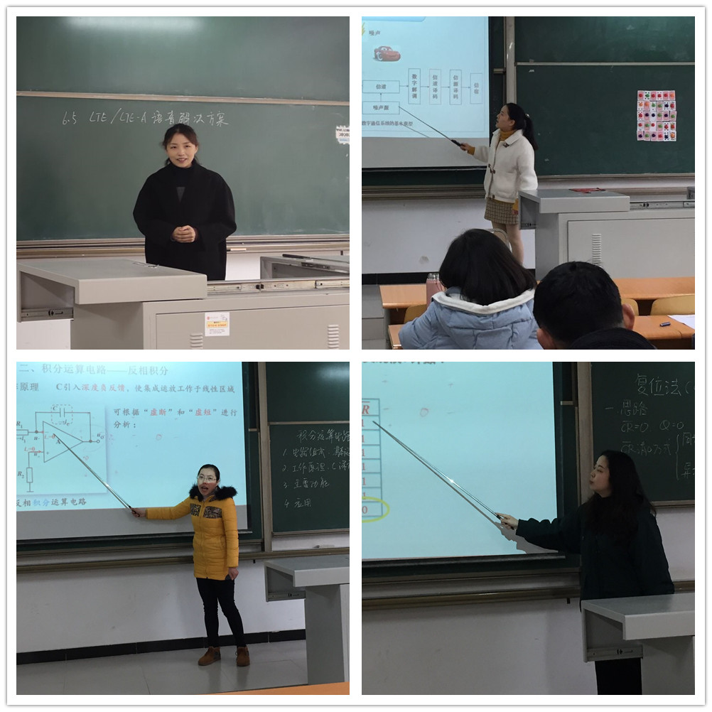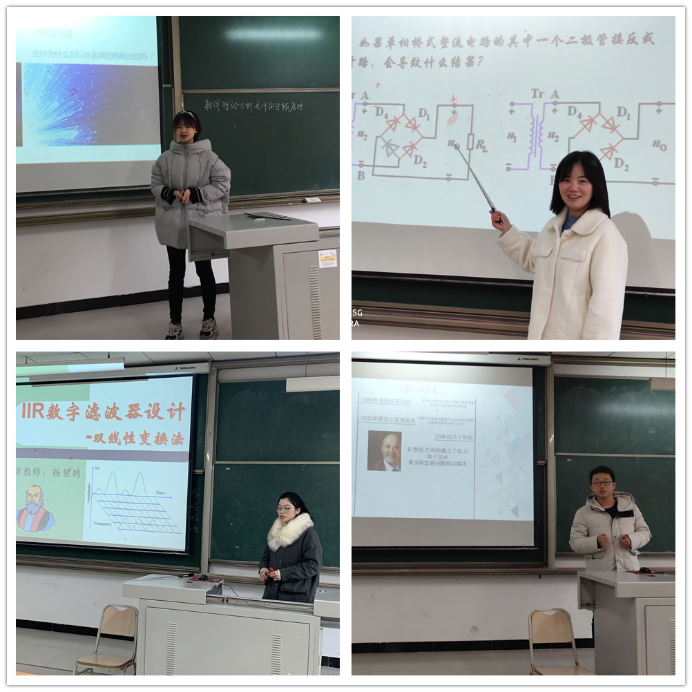 王喆老师讲解的是光纤的传输原理,她通过精美的图画,“一图抵千言”,将光的传播特性讲解得深入浅出、通俗易懂;黄颖老师讲课之前对板书进行了精心设计,整个板书如行云流水,赏心悦目;杨慧娉老师课件制作精美、毫不拖泥带水;杨晗老师则从课程特点出发,深入挖掘了课程蕴含的思政元素,使专业课程与思政理论课程同向同行,把思政教育与知识体系教育融为一体,实现了“知识传授”和“价值引领”的有机统一。