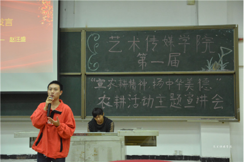 以“宣讲农耕精神,扬中华美德”为主题的艺术传媒学院农耕主题宣讲会于近日中午在3202教室举行。来自艺术传媒学院的250余名师生以及农耕协会的主要负责人齐聚于此,共同分享农耕与大学、大学生、大学学习生活之间的时代内涵。