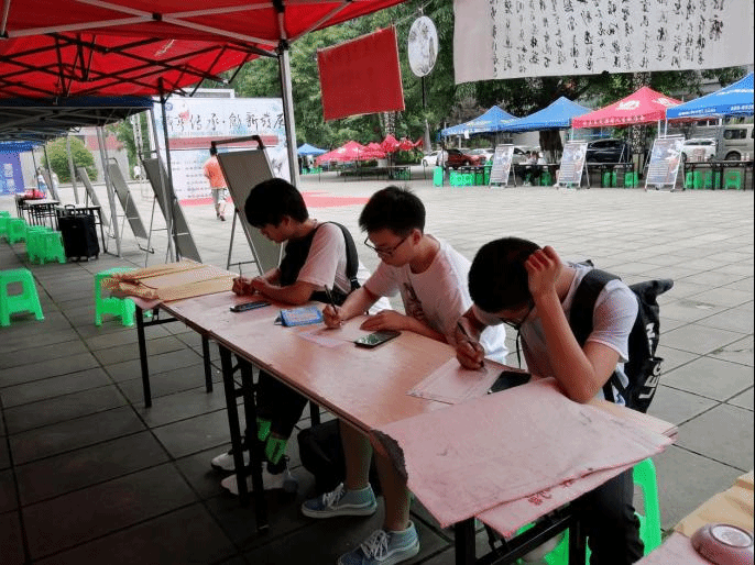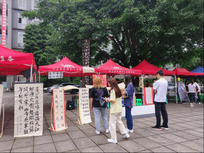 为大力弘扬中国的传统艺术文化,丰富校园文化生活,展示当代大学生的风采,书法与美术协会将以优秀传统文化——书法、国画等形式庆祝中国共产党成立一百周年,近日,我校传统文化社团联盟会员单位书法与美术协会在黄桷树广场开展现场书画大赛暨优秀作品展。