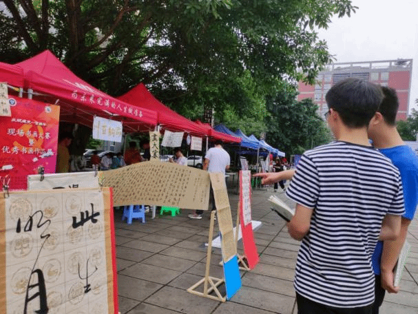 驻足参观优秀书画展览的同学们都沉浸在属于自己审美的世界中,有的在优秀作品前驻足,认真观赏,细细品味,有的认真欣赏现场创作的书画作品,看着一副完整作品的诞生。