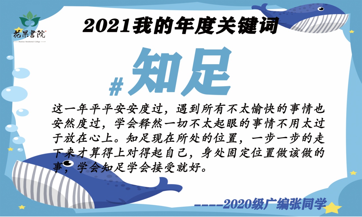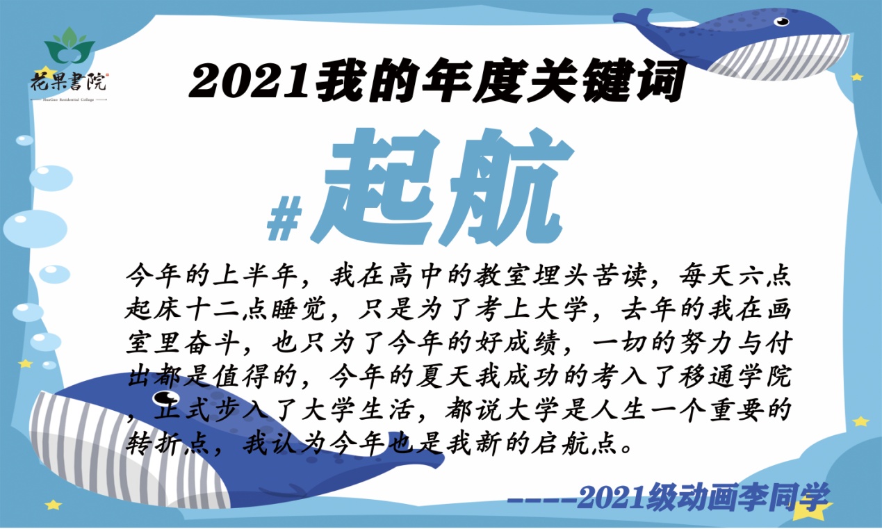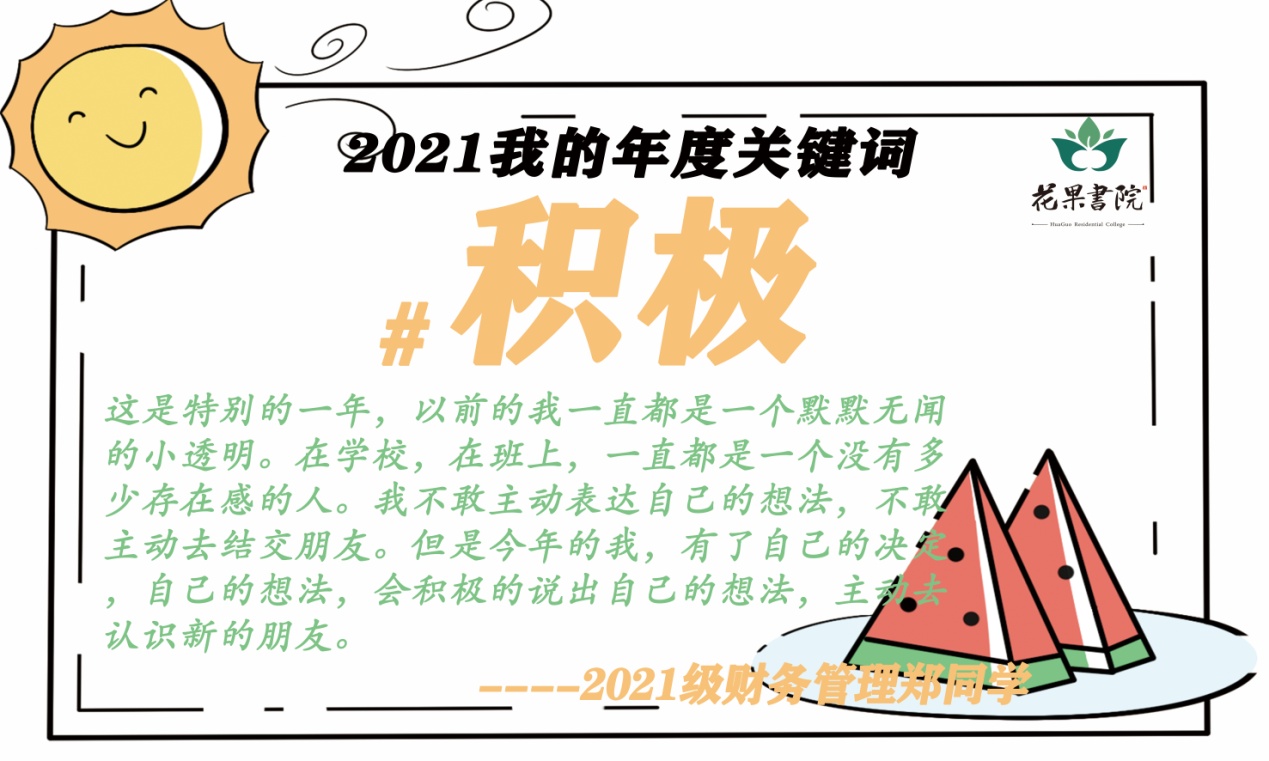 “什么是时光?是我们穿上的衣服,再也脱不下来了,对我来说,我的2021关键词,是成长吧。”“我的关键词是努力,不仅仅是为了奖学金,更是为了以后找更好的工作。”“我的年度关键词是重启,因为以前非常贪玩,现在进入一个新的环境就想着改变自己,告别过去。”“我的年度关键词是坚持,当我褪去大一的满身新鲜感后,在浮躁、节奏快的氛围里,要重拾勇敢和上进,不管是学生工作还是学习生活,都要坚持那份勇敢且上进。”......时光是条长长的河,在这条河里,我们游过来年少,游过了青春,每一个关键词都是我们成长的见证,是我们青春的回忆。而这些关键词也在提醒着我们,在总结中前行,在总结中成长,在总结中收获。花果书院提供“你说·我听”2021年度暖心说心愿的平台,面对镜头,分享2021年让你印象深刻的故事、朋友、同学,在2021年尾给自己进行总结,不为已消尽的年华而叹息,扔掉昨天所有的疲惫与烦恼,让脚步轻盈,与时光相伴勾勒出成功的形状。