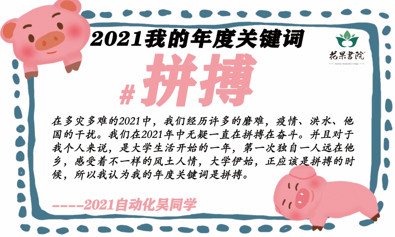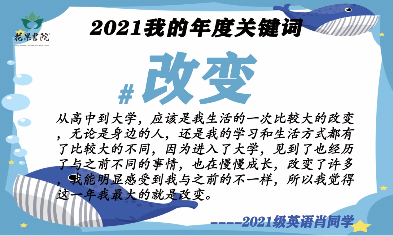 “所有的时光都是被辜负被浪费后,才能从记忆里将某一段拎出,拍拍上面沉积的灰尘,感叹它是最好的时光。”转眼间,2021年已经接近尾声,它如同手中紧握的沙子,无声无息的流失。在这一年里有很多流行的梗的背后都凝聚着不同的人物故事、精神状态,花果书院“2021时光机”年度关键词活动在线上收集同学们的关键词,作为大学生的我们,一年的时光让我们有收获、有喜悦、有悲伤,当它们汇聚在一起时,专属于自己的2021关键词就出现在脑海中。