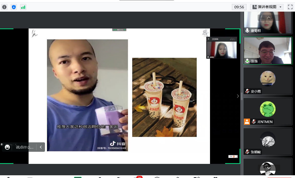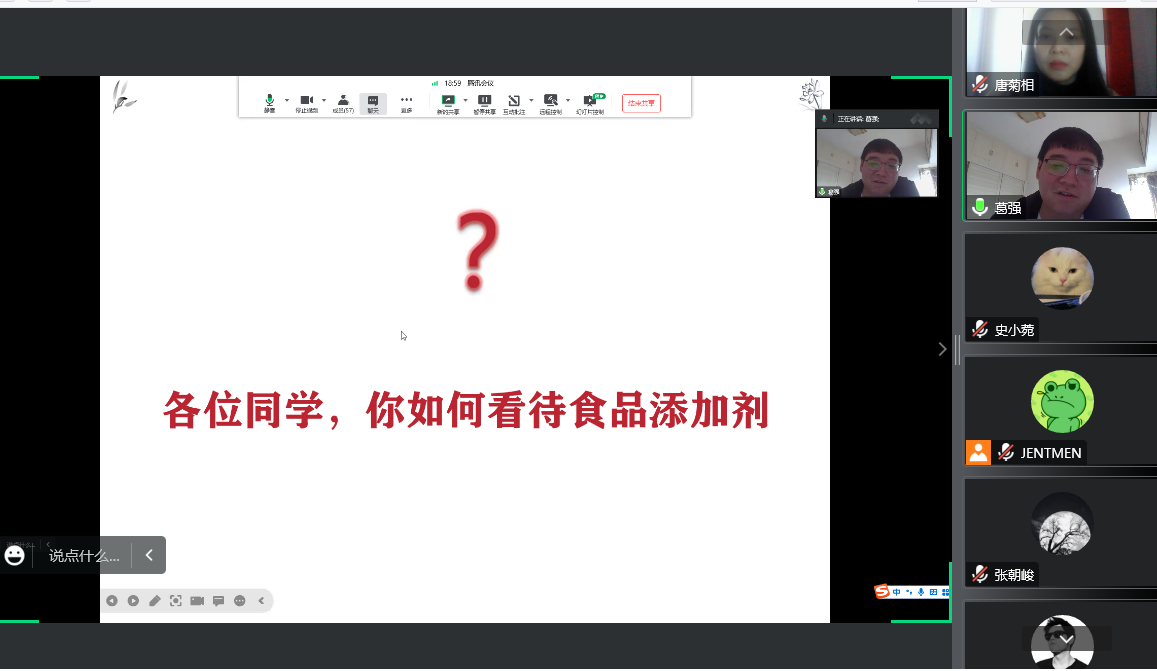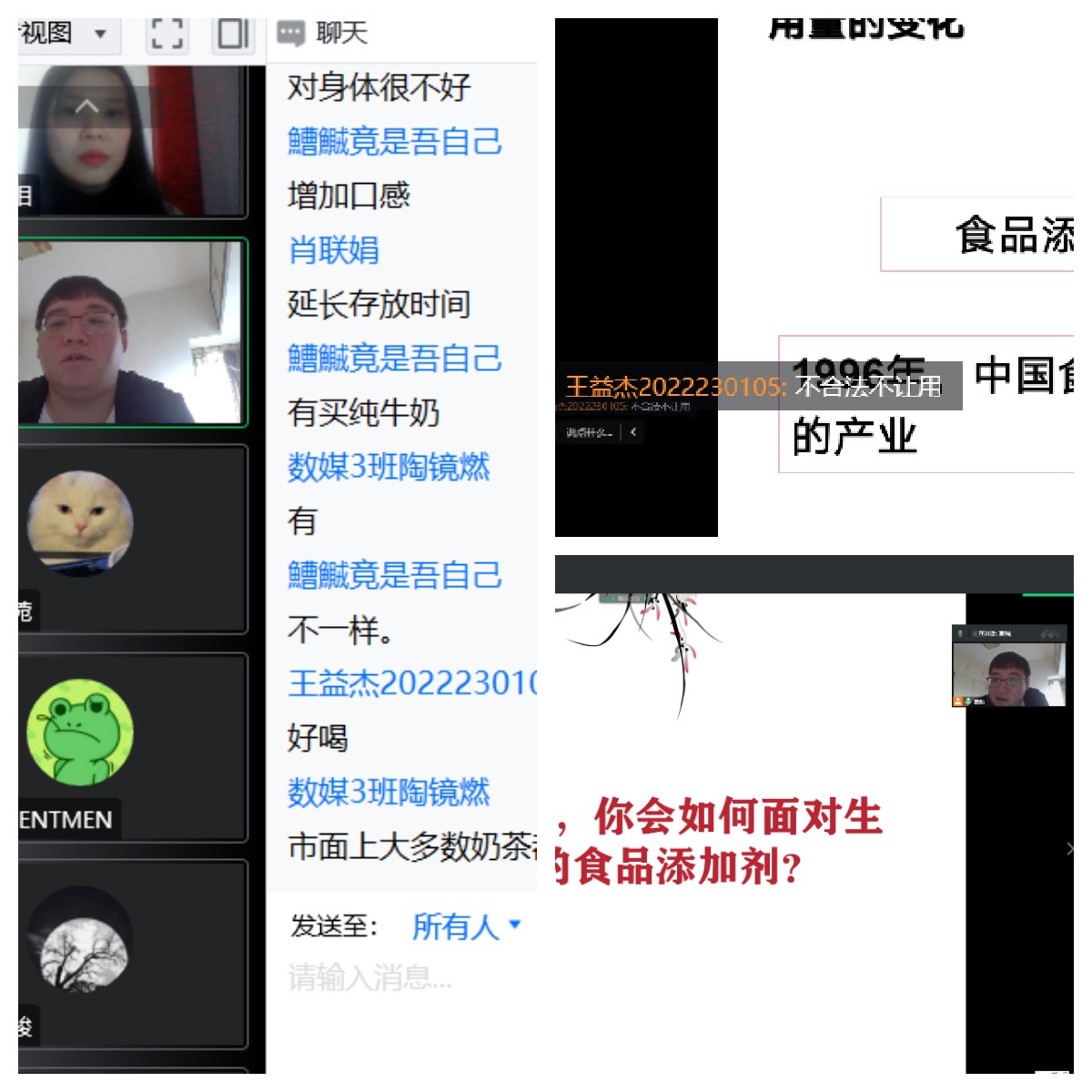 活动伊始,葛强老师先给同学们播放了一个视频,以海克斯科技为切入点,并以我们常喝的奶茶为例,引发同学们思考“如何看待食品添加剂?”同学们积极思考,热烈讨论和老师线上互动,气氛融洽。