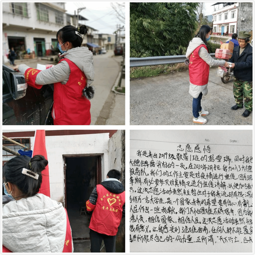 我是爱莲书院数字经济与信息管理学院2019级资产评估专业一班的李坤朋,面对新冠肺炎疫情的严峻形势,爸爸作为医生,他知道这次病毒的严重性和危害性,让我待在家里少出门,但我从电视新闻里看到那些逆行者和志愿者们,心里很是敬佩。“天下兴亡,匹夫有责”,我主动找到社区工作人员申请成为一名防疫宣传志愿者跟他们一起为这次疫情献出自己一份微薄力量,跟随社区干部对社区居民进行逐户入户登记调查,对外务工省返乡人员和外来人员进行详细的排查,做到不落一户,不漏一人。在赶集日,不管是晴天还是刮风下雨,早上六点起床,到场镇入口的防控点对来赶场的村民进行劝返,并提醒大家这段时间注意安全,减少外出,出门要戴好口罩,以减少集中赶场聚集传播的风险。志愿工作开始后,给我留下印象最深的是有效地增强了社区居民的病毒防范意识,提高了自我保护技能。
