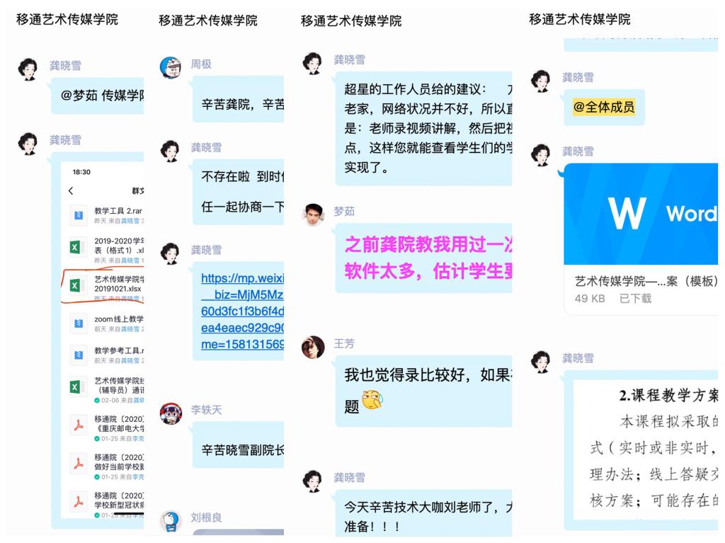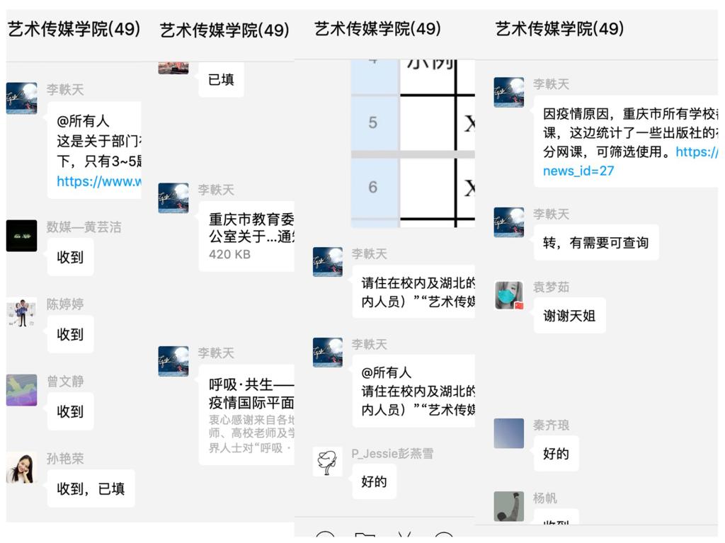 为确保每一名艺术传媒学院学子都能参与线上教学,都能充分利用好开学前的时间。艺术传媒学院全体教师先后通过电话、短信、微信、QQ等多种方式迅速宣传线上教学相关信息,及时让学生和家长了解情况。随后,在李轶天副院长、教学副院长龚晓雪及各教研室主任等领导的牵头下,详细梳理了春季学期课程情况,并对所有开课教师的授课方式、授课计划和准备情况进行了充分的了解。艺术传媒学院副院长李轶天表示:“面对疫情,我们应充分应对,从自身做起,做好防疫防控攻坚战。在教学方面方面勤思考、多尝试、广试用,在授课方式和模式上充分调动自身专业优势,切实做到定位准、方式新、效果好。利用网络平台搭建特殊时期教学方式,联动专业与学生,确保各科顺利开展。”教学副院长龚晓雪表示,“在教学管理工作上,我院提出三点:一、优化教研团队线上教学,组织教师线上交流总结教学方法和经验;二、督促学生线上学习,全体教师按照课表安排按时上课,帮助学生做好听课笔记。三、加强教学反馈互动,发挥教师在线上教学中的指导和辅导作用,建立师生互动反馈机制”。院系作为教学的基本单位,在这场没有硝烟的“战役”中,为全面推进教学工作有序展开起到了关键的领导作用。