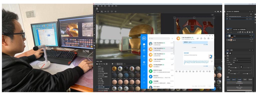 在线课堂首先需要解决的问题是如何做好课堂演示。动画教研室的刘根良老师经过前期的大量调研与学习,总结出“腾讯课堂+钉钉”的嵌套教学方式。腾讯课堂能够稳定、同步地展示课程内容并且回答学生提问,钉钉则用来做课堂考勤记录。通过这样的嵌套方式能够最大程度上还原课堂教学的效果,达到教学与考勤、听课与互动的结合。