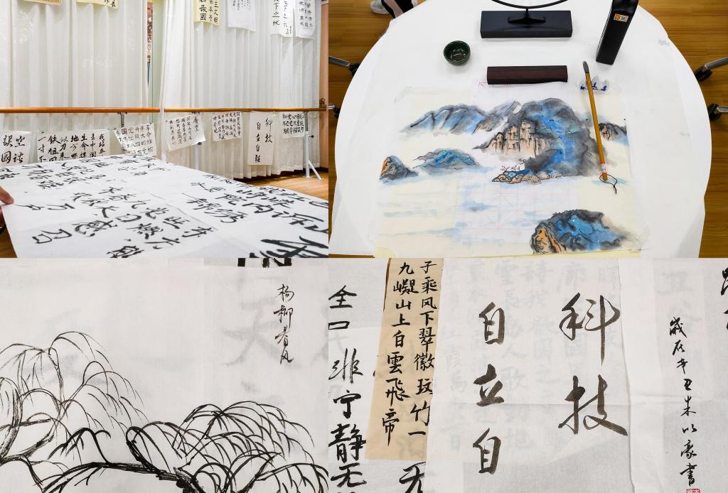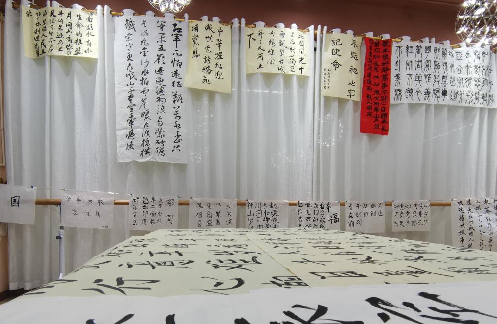 书法作品,布满了一楼排练厅,四周的墙面陈列了各类书法作品,置身其间,如同进入文字的世界,随意望去,都是吸饱墨水的爱国诗歌。“旭日东升放光华,神洲处处披锦霞。长城内外江山美,大河上下起浪花。塞北飞雪连天舞,江南垂柳春色佳,祖国何山多锦绣,看我一曲颂中华。”学生的原创诗歌,读后更是让人心潮澎湃。