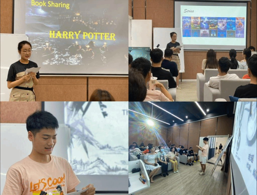 本次交流会以优秀学生代表分享读书心得为主,陈菲杨-《哈利波特》、张洺康-《射雕英雄传》、覃戬-《狼王梦》、辛博-《羊脂球》、付瑞桓-《刀锋》,为更深入、更生动形象地让与会师生了解所分享的书籍,每位同学都在分享时,辅以PPT展示,一张张精美的图片把分享会屡屡推向高潮。