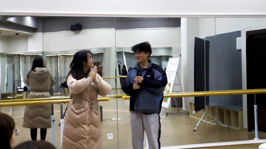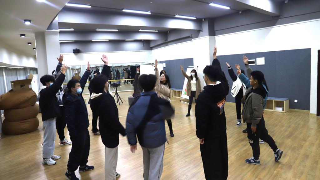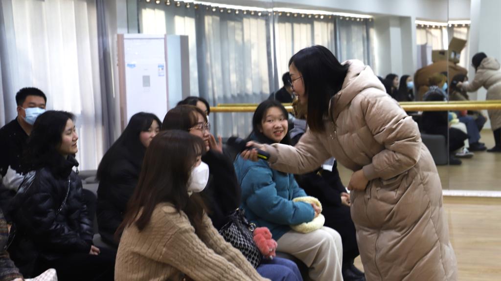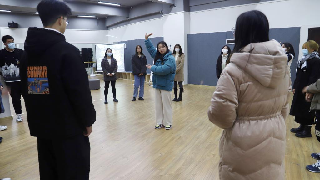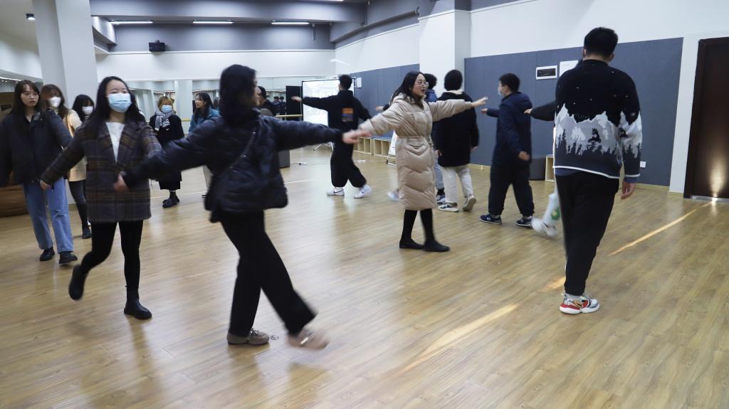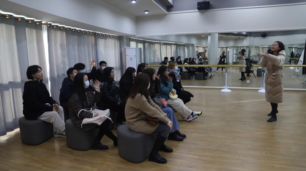 随着讲解的深入,摆手舞的视频把现场的气氛推到了高潮。做完动作详细分解后,齐老师带着同学们一起跳起了摆手舞。同学们模仿着土家族人庆祝丰收的场景围成一圈,随着音乐节奏摆起手来,亲身体验土家族风情。
