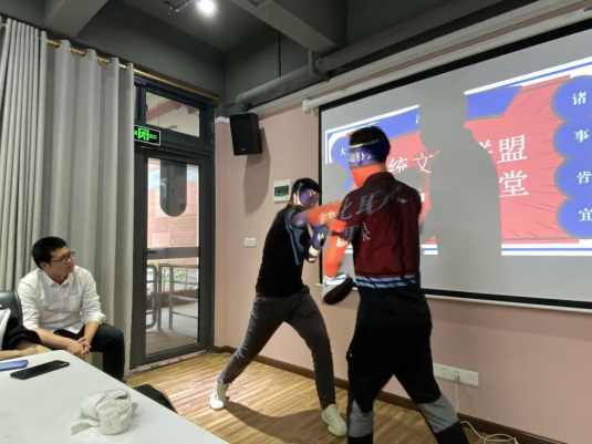 在进行一段互动后,社长开始展示有关拳击比赛的影片,影片中双方选手第一阶段处于对峙与游离期;第二阶段用微小的动作欺骗对手,发起猛攻,对方采取防守式反击,以自身力量进行反抗。热血的对战,燃起现场所有同学的激情,也让大家对武道比赛多了一份意犹未尽。