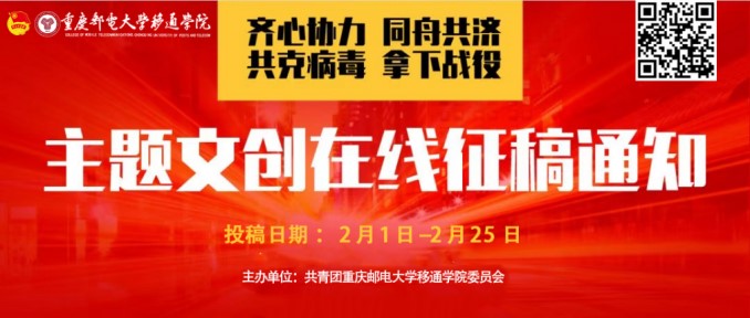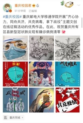 2月1日,由我校团委主办、各学院团总支承办的“齐心协力,同舟共济,共克病毒,拿下战役”主题文创作品征集活动正式启动,征稿作品分为美术类、设计类、视频类、文稿类四大类,遵循抗击疫情的真实性,宣扬积极、健康、正能量,统一以电子稿的形式在线征集并展示,并受到重庆共青团、重庆校园君等知名微信公众号、微博平台相继报道。