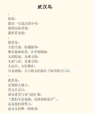 作品介绍:面对疫情,有人冲在抗击疫情的最前线,有人辗转在运送物资的后方,有人奔波在防止疫情扩散的路上。我相信,在这场阻击战中,我们一定会克服困难、不惧艰险;待到出暖花开,百鸟争鸣;是一个生机盎然的中国。中国加油!武汉加油!