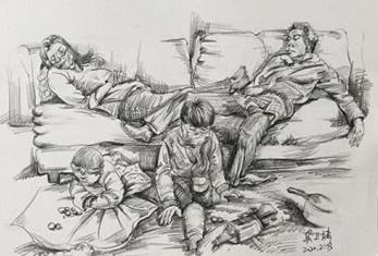 在这一笔一划间,不难看出作者心中的担当;那或昏暗或明亮的颜色选用,所呈现的或许正是当代大学生心中的责任感和使命感。这线条交错、明暗交杂的一个个作品,呈现给众人的正是那份属于青年学生的责任与使命。