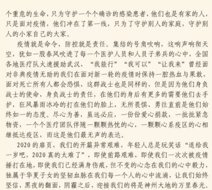 美术类的获奖优秀作品欣赏完,相信同学们感受到了医护人员们舍小家,为大家,不分昼夜、不知疲倦的救治感染患者,在厚重的防护服后流露出白衣天使们击败病毒的决心与信心。