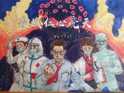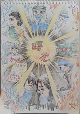 有同学用铅笔,以速写的形式展现了一线的工作者,用流畅的线条黑白的画面深刻的描绘了一线英雄们的战斗。亦有同学让颜料相互碰撞,用画笔呈现内心美好的祝愿,用希望去温暖这个冷清的春节、这个“白色”的寒冬。素描、彩绘、漫画等丰富多彩的形式,书写的、绘制的是希望,更是中华民族的传统美德与民族气节。