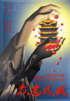口罩、黄鹤楼、武汉加油、中国加油等元素的组合;红色、蓝色、白色的配合使用;手挽手肩并肩地医务人员、相互支持的手臂。要相信这里面所呈现的远远不如那方战场那么残酷,但是中华民族的团结、勇敢、无畏终将会战胜这一切。源远流长的华夏文明,在漫长的历史长河中不知战胜了多少苦难,无论是天灾还是人祸都挺过来了,这次也不会例外。