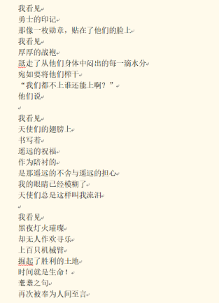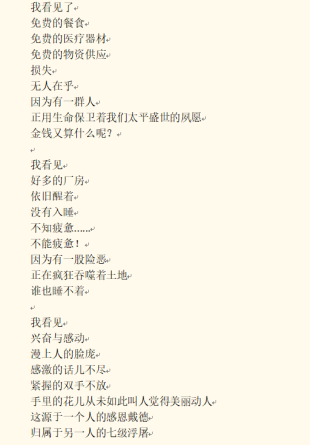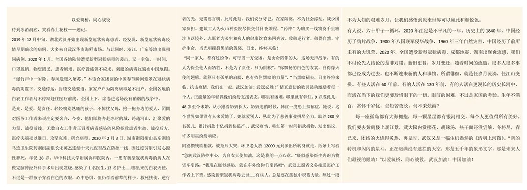 品味过色彩丰富的画作,是时候细读一个个方块字所组成的文章了。诗歌、小小说、散文等创作形式层出不穷。在这一词一句、一点一逗里,是担忧、是希望、是感慨也是担当与情怀。平平仄仄所凸显的是当代大学生心中的美好愿望,字词句段里饱含的是对一线英雄们的致敬。