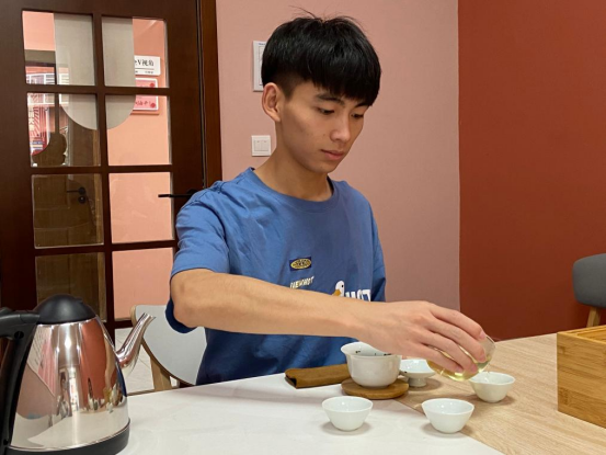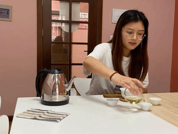 杯中的茶与高温的水相互碰撞出火花,茶香味弥漫在整个房间,令人心旷神怡。社长展示完之后,社员们跃跃欲试,两位积极的社员上去尝试,社长在一旁指导。社员在社长的带领下小心翼翼的操作着,洗杯、泡茶、分茶等步骤顺利完成,社员们也学会了简单的茶艺。茶艺的展示拉近了与传统文化的距离,也拉近了社长与社员的距离。