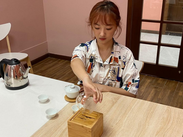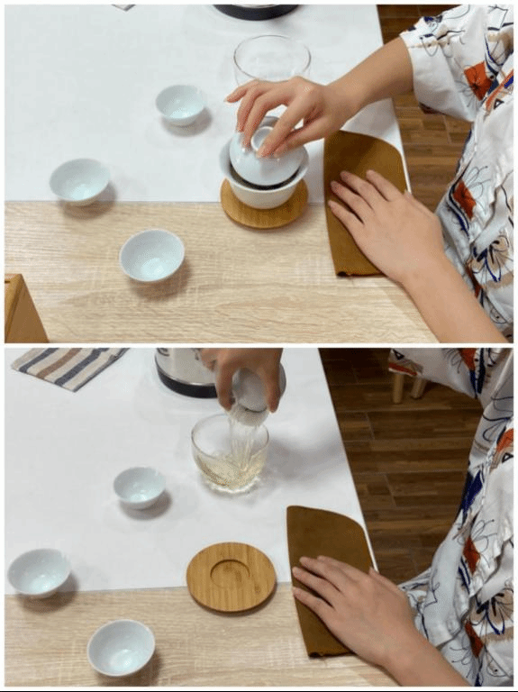 其次,社长现场演示了茶艺的三个步骤:洗杯、泡茶、分茶。将烧沸腾的泉水注入空碗,然后把茶杯放入其中,在碗中旋转,再把空碗中的水倒入盖碗,倒入公道杯中晃动完成洗杯。随后继续在盖碗中放入茶叶,将开水注入盖碗,快速将水倒入公道杯中完成泡茶。最后将茶水从公道杯倒入空碗,将茶杯放入空碗中,再次倒入开水,用盖拂去泡沫,再倒入公道杯中完成分茶。