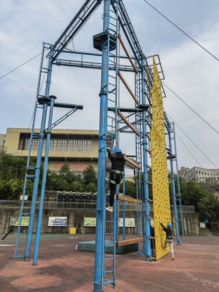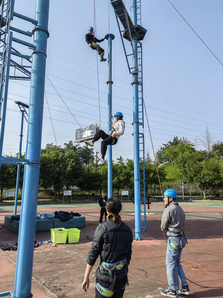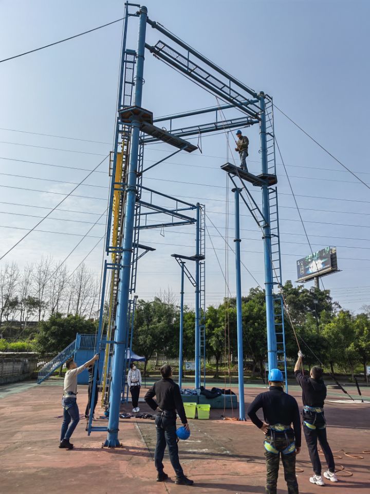 在拓展高空基地进行高空设备安全排查及交流,大家仔细排查高空连接点、钢丝绳、螺丝松紧、攀岩是否松动等,一一排查完毕。确保安全情况下,教练对每个项目亲自进行挑战,一方面教练间可以进行相应交流,快速投入上课状态。另一方面可以切身体验学生高空感受,更好的开展相关培训,引导学生分享,帮助团队更好的成长。