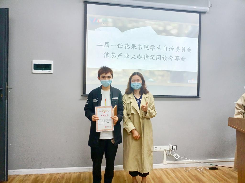 活动尾声,吴静老师、胡霁贤老师为参与本期阅读分享会的同学们颁发了活动纪念品,并为李辉杰同学颁发了“信息产业大咖传记领读达人”荣誉奖项。大咖传记中的主人公们不仅是同学们的榜样,更是同学们在未知道路上探索的明灯。在阅读中与大咖对话,在阅读中汲取商科思维,在他们的指引下,同学们终会找到属于自己的道路,踏上名为未来的征程。在每一个平凡的日子里,循着光的方向,不畏艰难险阻,终将踏过荆棘,迎接星光熠熠的未来。