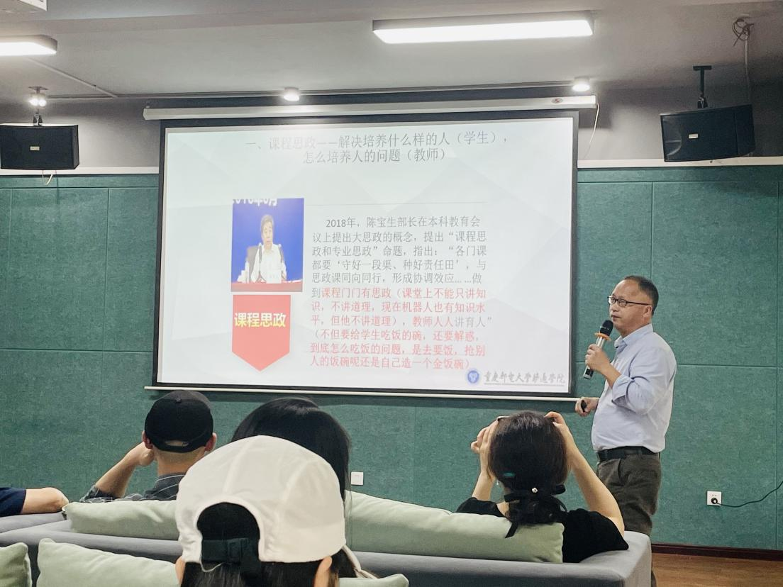讲座中邹老师首先为各位老师点明了课程思政的实质:从学生的角度来讲就是“解决培养什么样的人的问题”,从老师的角度来讲就是“解决怎么培养人的问题”。邹老师强调各专业课融合思政课程的重要性,各门课程都应该与思政课程同向同行,形成协调效应,做到课程门门有思政,教师人人讲育人。教师应该既讲知识,又讲道理,既给饭碗,又教如何吃。