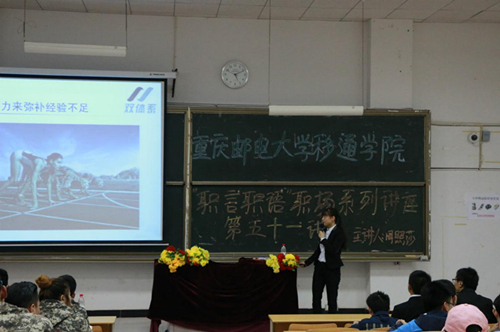 讲座开始,周照莎老师用充满激情的语言讲述了当今大学生面临的各种困难和如何进行自我提升。她举了很多自己亲身经历的例子,进一步为大学生讲解了职场的实战应用,由此总结出对初入职场的大学生职业选择的警戒线:第一、对实现目标没帮助的不能选,即走弯路又浪费时间和青春;第二,不能提供培训机会或锻炼机会的企业不能选,没有提高,发展缓慢;第三,没有师父带的不能选,对于职场菜鸟有师傅带能更快的融入其中。同时告诉我们要学会承担责任,明确自己的目标,抛弃那种不想长大的想法,趁年轻要不断提升自己,超越自己。
