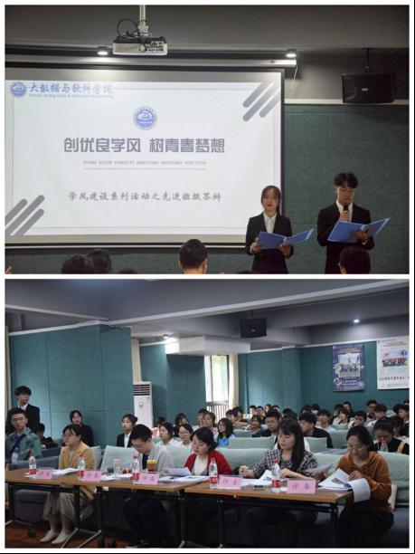 为增强班级凝聚力,树立先进学习典型班级,展示学院各班级在学风建设中取的成果,并向各班级提供一个展示成果、互相学习的平台。大数据与软件学院于4月28日下午在爱莲书院多功能影音室举行办了“创优良学风,树青春梦想”学风建设系列活动之先进班级答辩。莅临本次活动的嘉宾有大数据与软件学院计算机科学与技术专业负责人蔡宇老师,数据科学与大数据技术专业负责人徐琴老师,社团活动指导老师彭崇清老师,2019级数据科学与大数据技术辅导员黄真老师,2019级软件工程辅导员汤曲老师以及2020级辅导员老师们。