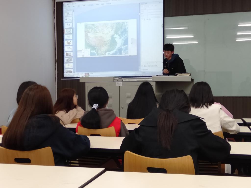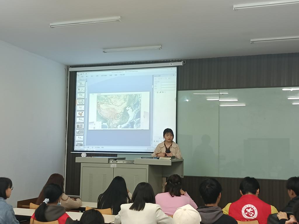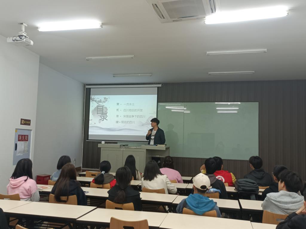 此次传统文化历史小课堂分为三部分展开。一开始,罗桢林同学以四川的自然地理环境为切入点,从地形、气候、水系、土壤等多方面分析了四川形成天然复杂险峻的地理位置优势。场下的同学发出感叹:“还真是如《蜀道难》中所描述的的川蜀一般,‘蜀道之难,难于上青天’啊,何其乘高居险”。古巴蜀历史悠久,罗桢林又结合近期社会热门话题“三星堆”带领同学们了解了更加久远的巴蜀文化。