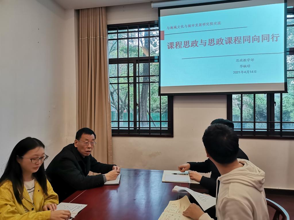 全面推进课程思政建设是落实立德树人根本任务的战略举措,是全面提高人才培养质量的重要任务。为进一步推进我部门课程思政建设工作,充分发挥课堂主渠道、主阵地在高校思想政治工作中的作用,提升课程思政育人实效,地域文化与城市发展研究院在4月初集体学习我校《关于印发<课程思政建设工作实施方案(试行)>的通知》(移通委〔2020〕32号)等文件的基础上,于4月14日召开全面推进课程思政工作会议,邀请思政教学部毕毓璟老师做专题讲座,展开深入交流座谈。