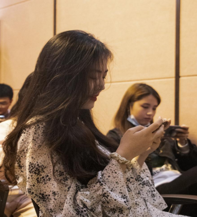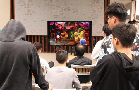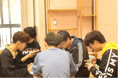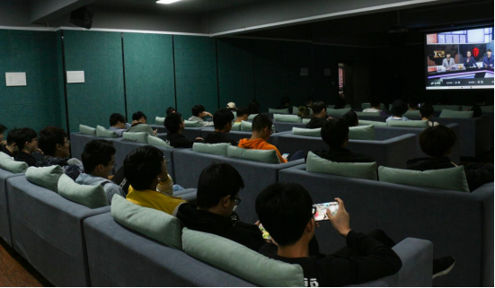 在参赛者的欢笑声中,激烈的“厮杀”结束,转而又来到了一个新战场。一张白幕缓缓升起,英雄联盟春季赛季后赛半决赛RNG VS TES的比赛现场便在这白幕上拉开序幕。来来往往的同学们无论是否是英雄联盟的玩家都纷纷为这精彩的“厮杀”停滞住脚步。职业选手们的操作不同于隔壁参赛选手们的青涩,一进一退招招见血,每步走位、买装、开团,处处是谋划,精彩绝伦的比赛吸引了所有人的目光。