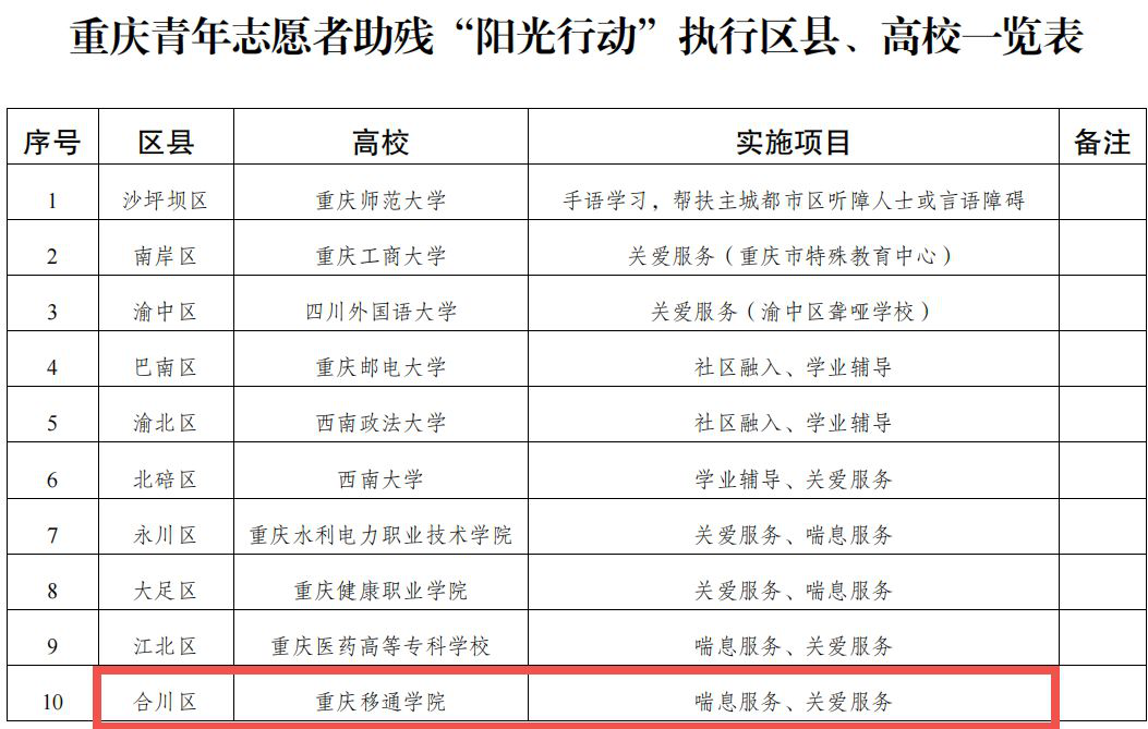 重庆移通学院“馨小青”助残青年志愿服务分队是向全校招募、通过两层面试,最终在500余名报名者中,选拔出100名优秀志愿者。该队伍的建立将积极弘扬“奉献、友爱、互助、进步”的志愿精神,围绕“关爱服务”“喘息服务”两个方向,为残疾青少年群体办实事、做好事、解难事,助推重庆市助残志愿者服务事业发展。