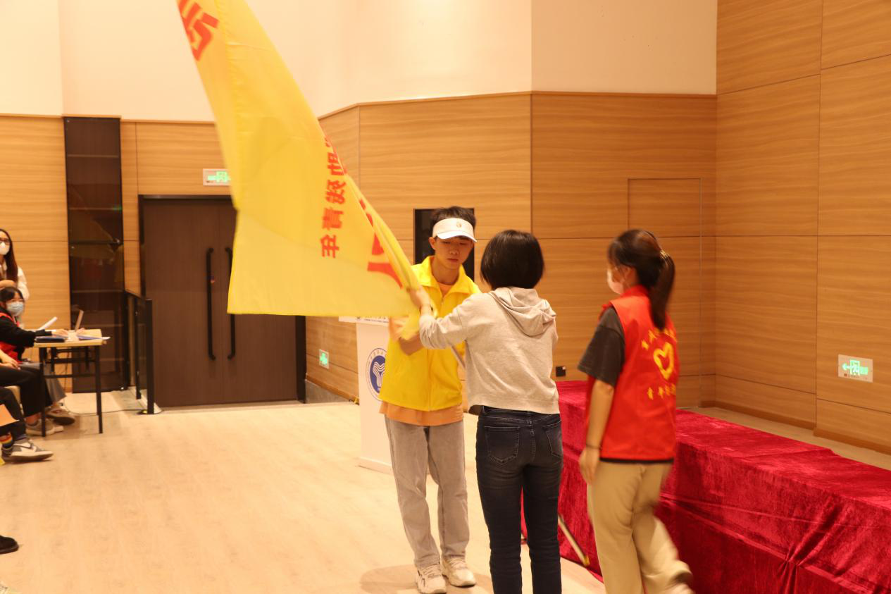 (团委副书记谢银平老师为志愿者代表谭正授旗)