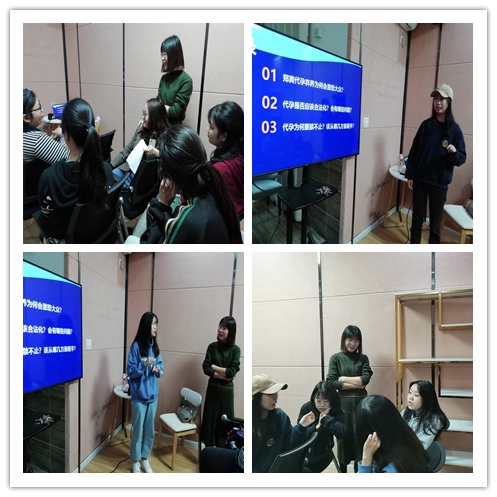 热烈的讨论后,同学代表分别对三个问题分享自己的看法,针对第一个问题,第一组代表认为郑爽“代孕弃养门”事件之所以激怒大众,最根本在于郑爽作为一个公众人物对生命的漠视以及对法律的无视,直接挑战了国家和社会的容忍底线,给社会和青年人树立了一个极坏的典型,与社会主义核心价值观完全背道而驰,在场同学们表示一致认同。针对第二个问题,同学们讨论得十分激烈,也有不同的看法,第二组第一位代表认为代孕应该严厉禁止,否则女性将会沦为”生产“工具,贩卖婴儿,遗弃婴儿的现象将会更普遍;第二位代表认为对于一些”特殊“家庭来说,代孕合法化可能也会为这些家庭带来新的光明与希望。随后靳老师播放了纪录片《代孕者》,在观看视频的过程中让同学们对”代孕“是否合法化,有了更清晰的认识,普遍认为”代孕“的确应该明令禁止。针对第三个问题,第三组也派出代表说出了自己的想法,随后曾易老师与吕柔倩老师也从不同的角度为同学们分析了禁止代孕的具体措施,把整个活动推向了高潮。