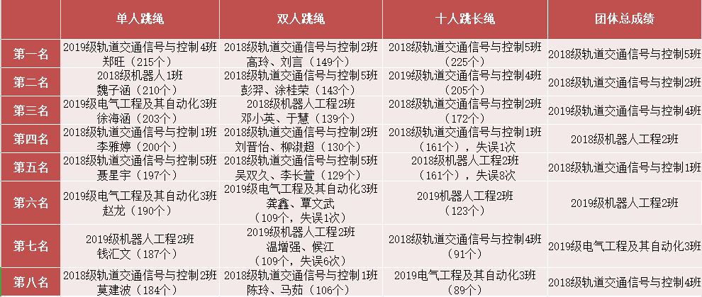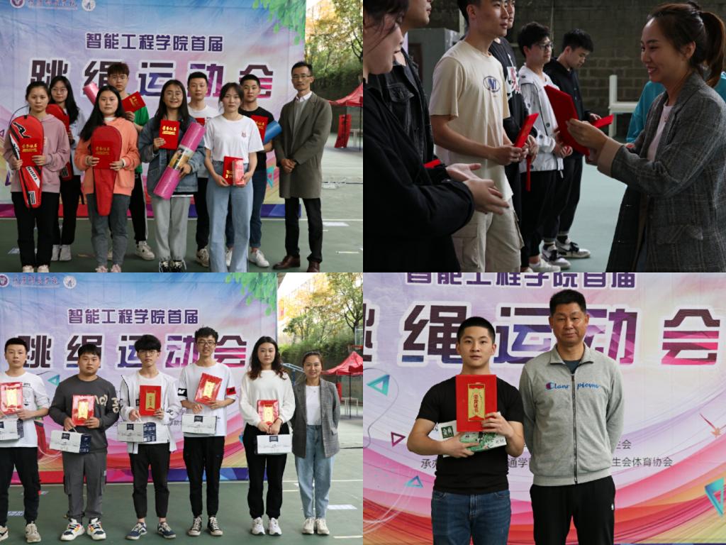 下午17点40分,智能工程学院首届跳绳运动会闭幕式正式开始,主持人分别宣布单人跳绳前八名、双人跳绳前八名、十人长绳前八名的获奖名单。竞技体育中心刘玉林主任、智能工程学院李巧副院长和团总支书记郭菲老师分别为团体总分一二三等奖的班级进行了颁奖。