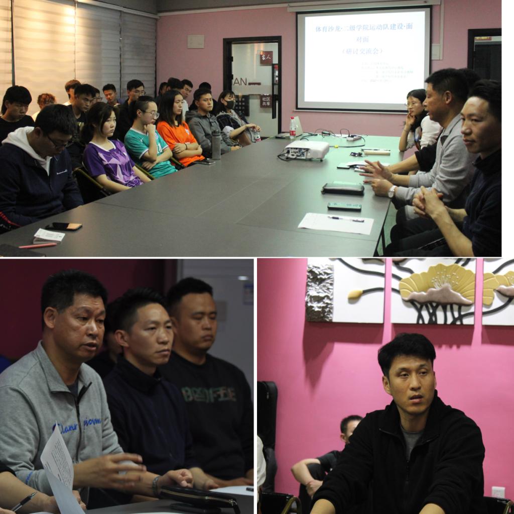 在交流分享环节,艺术传媒学院李克伟院长首先表示,希望各二级院队能够放眼长远,克服起步之初的困难打好基础,同时建议加强队伍中竞技文化建设,使更多的人能够从中感受到竞技体育的魅力。智能工程学院李巧院长在分享中介绍了智能工程学院的基本情况,表示将尽力推进院队的建设,同时鼓励相关同学充分发挥自身的主观能动性,为院队的建设筹备添砖加瓦。大数据与软件学院王焱院长则希望各队在教师与教练的专业支持同时,积极发挥自身作用,并表示只要是同学们的合理要求都将会得到院系的充分满足。随后,各院系代表队的队长与指导老师纷纷发言献策,同时也向在座的领导咨询求教,各位领导与老师也倾囊相授,针对队长们提出的招新、男女比例、训练积极性、队伍的传承等问题一一作答。最后,大家一致认为,校队的队员可以在院队中起到一定的指导作用;在训练中各院队可以积极相互交流共同训练;提升院队队员的成就感和荣誉感的重要性;对于招新需要进行针对性的引导等。