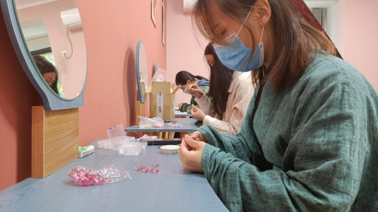 课堂伊始,社长向社员们讲解汉服文化,汉服文化不仅反映儒家礼典服制的文化总和,还体现在祭服、朝服、公服、常服以及配饰上,尤其强调其中的头饰,头饰是汉服的重要组成部分。社员们通过制作缠花琉璃发现汉服美所在,感受传统文化韵所藏,同时也很荣幸华韵的指导老师杨敏老师莅临现场,课堂上老师穿上汉服一同与社员们进行琉璃头饰的学习与制作,共同感受汉服文化。