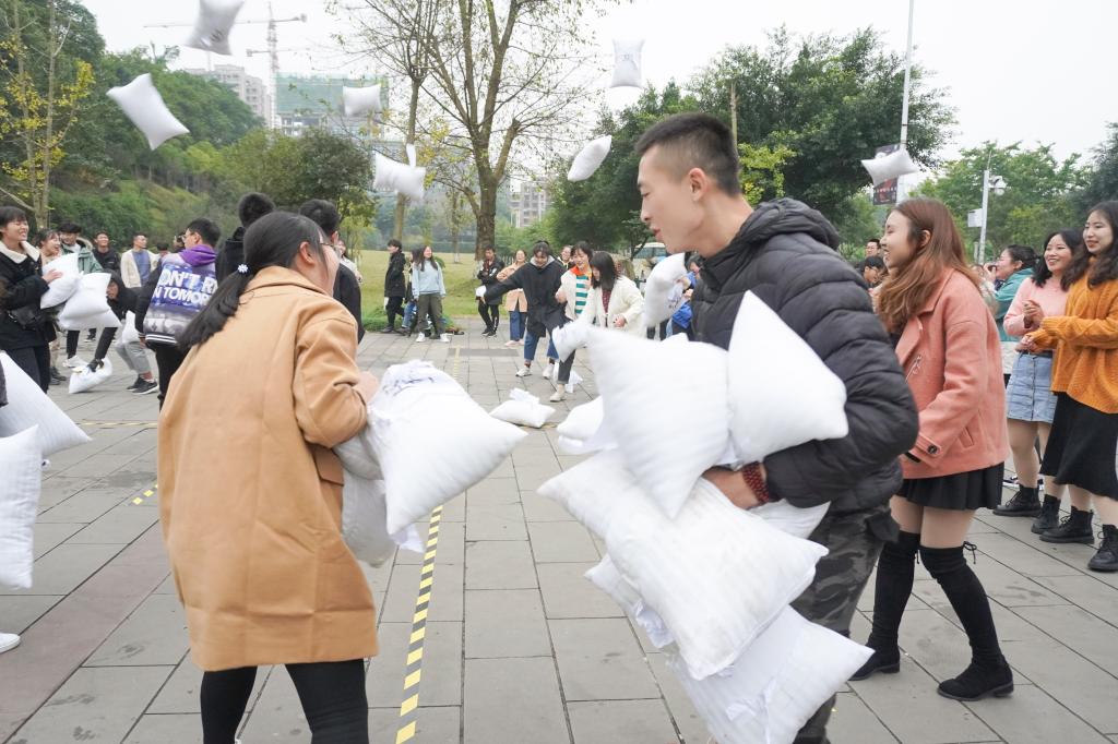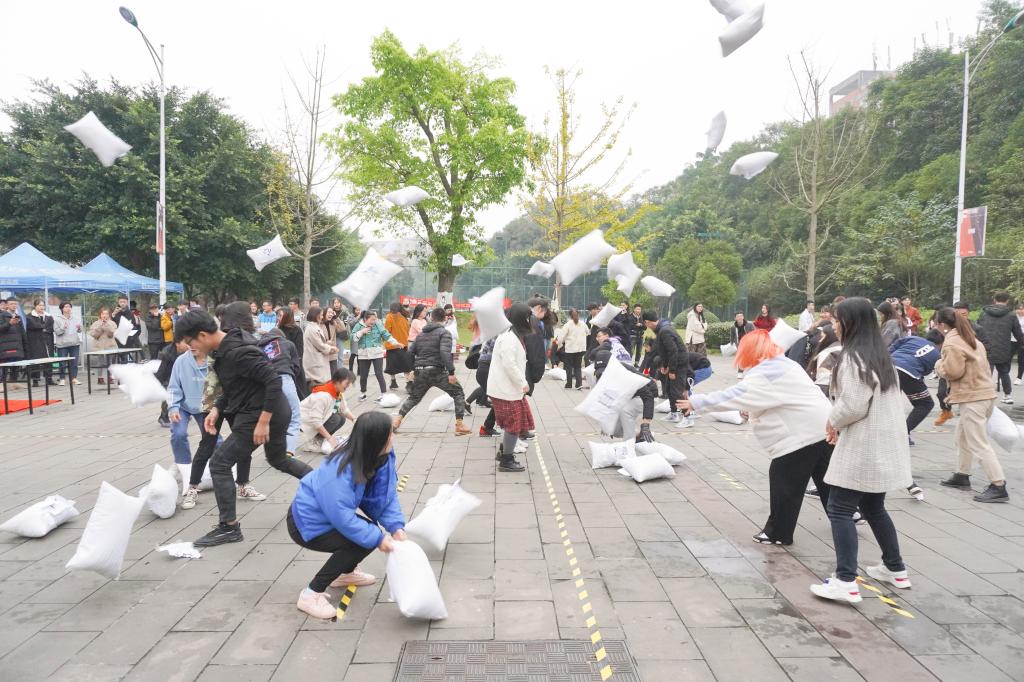 第三环节的枕头大战更是将整个活动推向高潮,每个队伍拥有15个枕头,选手在音乐响起时,需将自己区域内的枕头抛向其他队伍区域,枕头漫天飞舞,砸在身上却不觉得痛,小广场瞬间沸腾了起来。活动现场趣味横生,热情洋溢,助威声、呐喊声、欢笑声、鼓掌声此起彼伏,经久不息。
