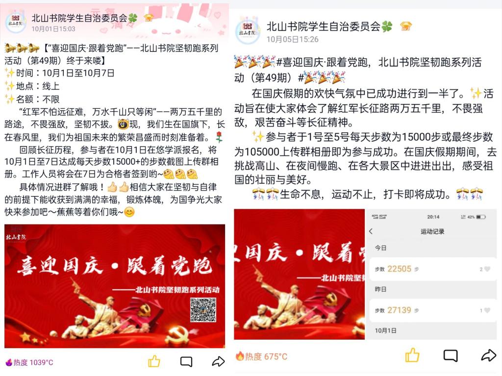 为让学子养成良好的打卡自律的生活习惯,了解长征精神的核心,明白自身为国家建设的下一代。在活动发布当日,北山书院通过官方公众号向学生宣传红军长征的艰苦经历,并解释长征精神在现代建设中的重要作用。在自律的同时,也致敬长征这一伟大历史奇迹。