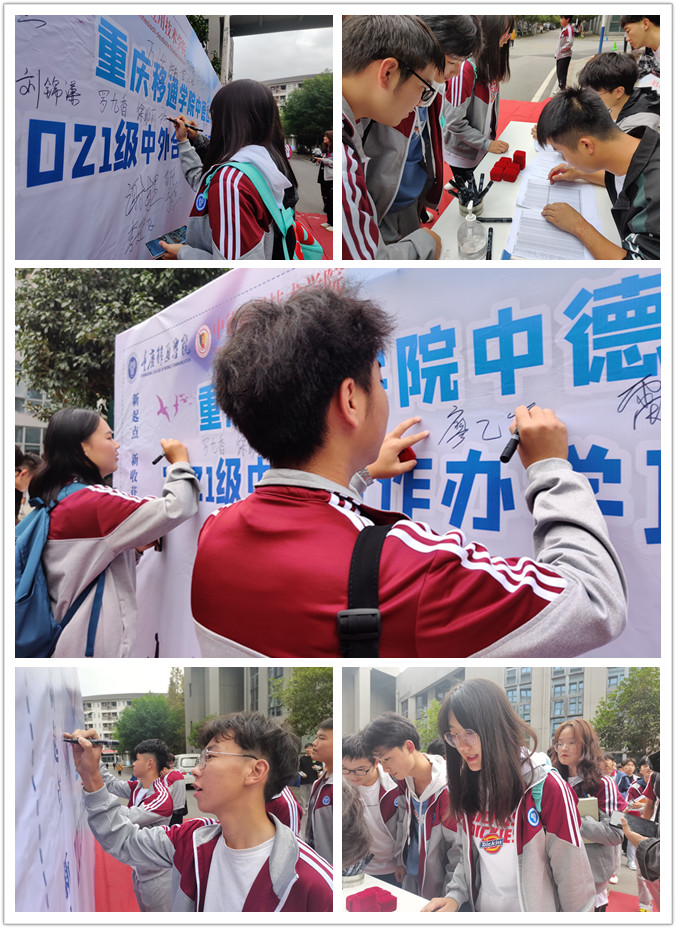 典礼开始前,校领导以及师生们在会场外签名墙签名留念,同学们身着整齐的校服,满怀激动与热情书写着对未来的美好期望。