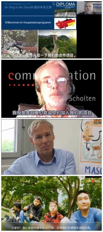 紧接着,德国合作院校领导以及中德海外优秀学子通过视频发来祝福,新生们在感动与欢笑中渐渐缩短了与德国的距离,清晰了未来学习和成长的道路。