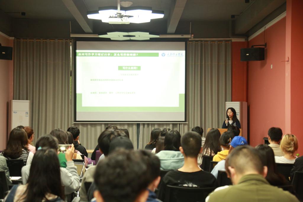 陈礽茵首先强调了新闻写作的生命就是真实性与准确性,保证新闻紧跟时效,同时也需要明确新闻讨论的范围、事件意义,要到活动中去找新闻,并通过举例,由浅入深地讲解,帮助同学们了解到新闻的特点和基本写作要求。
